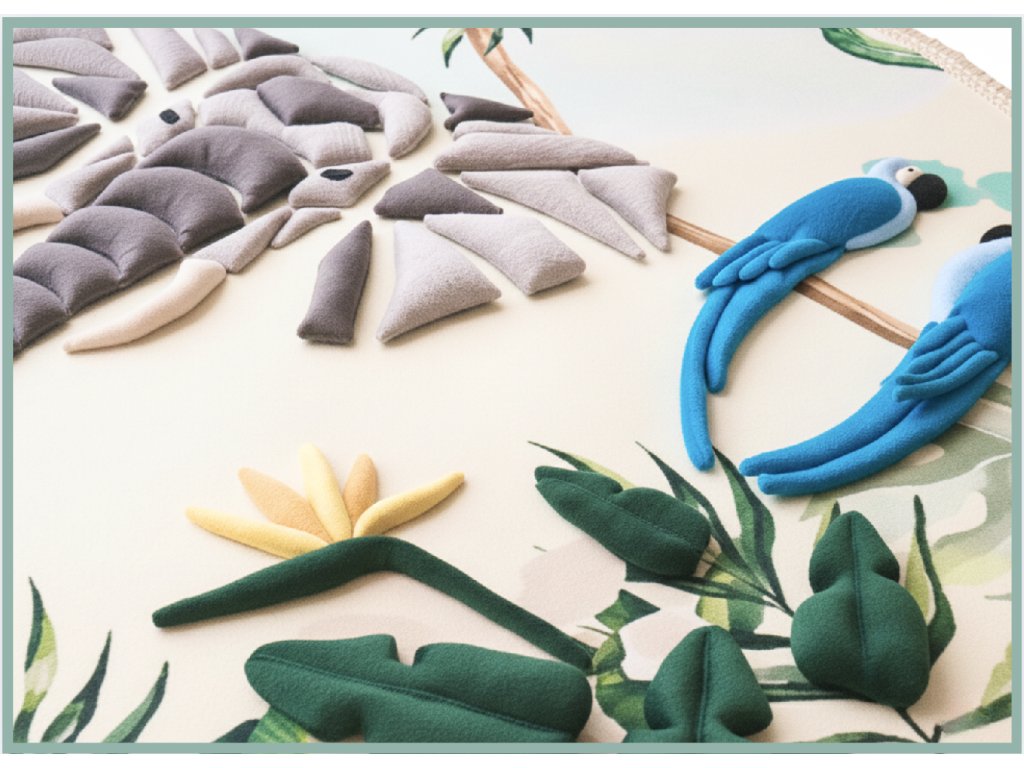 Hravá stimulácia – pískadlá ukryté v papagájoch prinášajú detskú radosť a podporujú pozornosť pri pohybe po koberci.